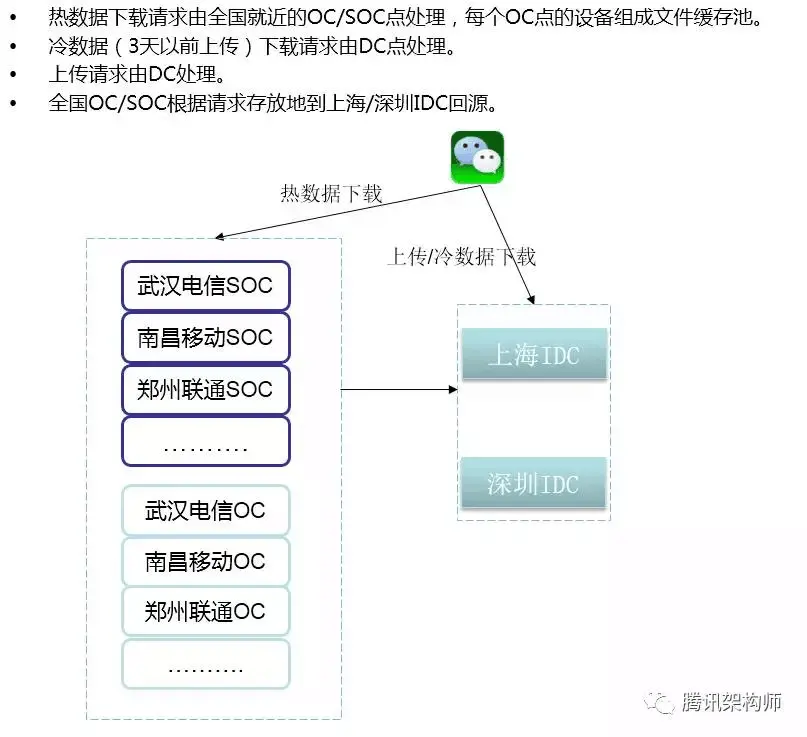 朋友圈的架构,主要分为OC和IDC两种,IDC指的是数据中心,即数据最终落地存储的地方,OC指的是带外网的独立机房,SOC指规模较大的OC。每个IDC都有一整套接口机/逻辑设备/存储设备用以支撑用户的上传下载、及文件落地存储的需求。