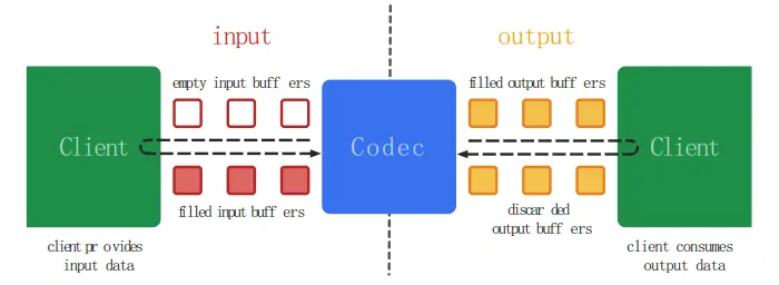 MediaCodec提供需要编解码的数据[存在输入缓存区],MediaCodec与底层编解码器交互,拿到处理后结果填充在输出缓存区供客户端使用,当前这种处理过程是异步的。
