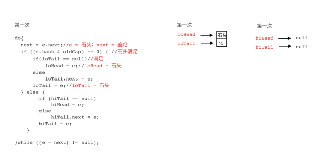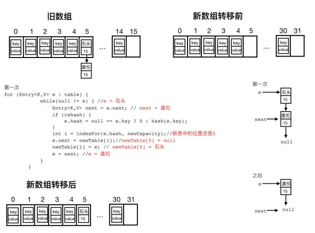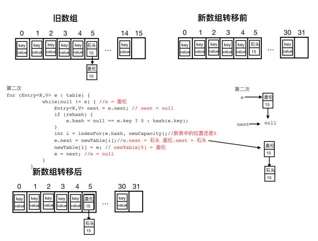 这段for循环的遍历会使得转移前后键值对的顺序颠倒(Java7和Java8的区别),画个图就清楚了,假设石头的key值为5,盖伦的key值为37,这样扩容前后两者还是在5号坑。第一次: