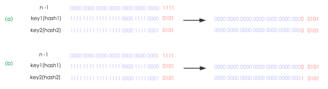 下面我们讲解下JDK1.8做了哪些优化。经过观测可以发现,我们使用的是2次幂的扩展(指长度扩为原来2倍),所以,元素的位置要么是在原位置,要么是在原位置再移动2次幂的位置。看下图可以明白这句话的意思,n为table的长度,图(a)表示扩容前的key1(5)和key2(21)两种key确定索引位置的示例,图(b)表示扩容后key1和key2两种key确定索引位置的示例,其中hash1是key1对应的哈希与高位运算结果。