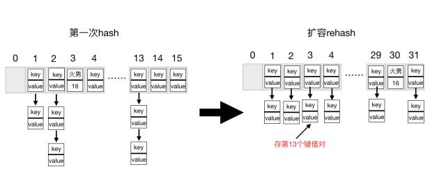 个人理解是,在未扩容前,可以看到如13号链的长度是3,为了保证我们每次查找的时间复杂度O趋于O(1),理想的情况是”一个萝卜一个坑”,那么现在”坑”多了,原来”3个萝卜一个坑”的情况现在就能有效的避免了。