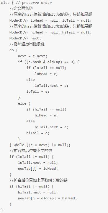 可以看到,Java8把初始化数组和扩容全写在resize方法里了,但是思路还是一样的,扩容后要转移,转移要重新计算在新表中的位置,上面代码最后一块高能可能不太好理解,刚开始看的我一脸懵逼,看了一张美团博客的分析图才豁然开朗,在分析前先捋清楚思路