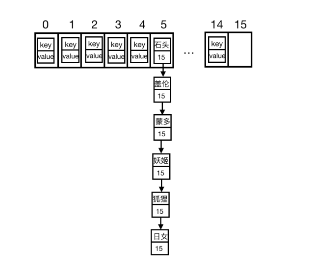 为了更清晰明了,还是举个栗子,下面的表定义了键和它们的hash值(数组长度为16时,它们都在5号坑)