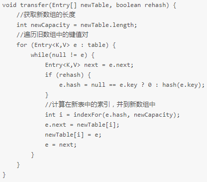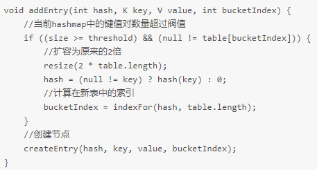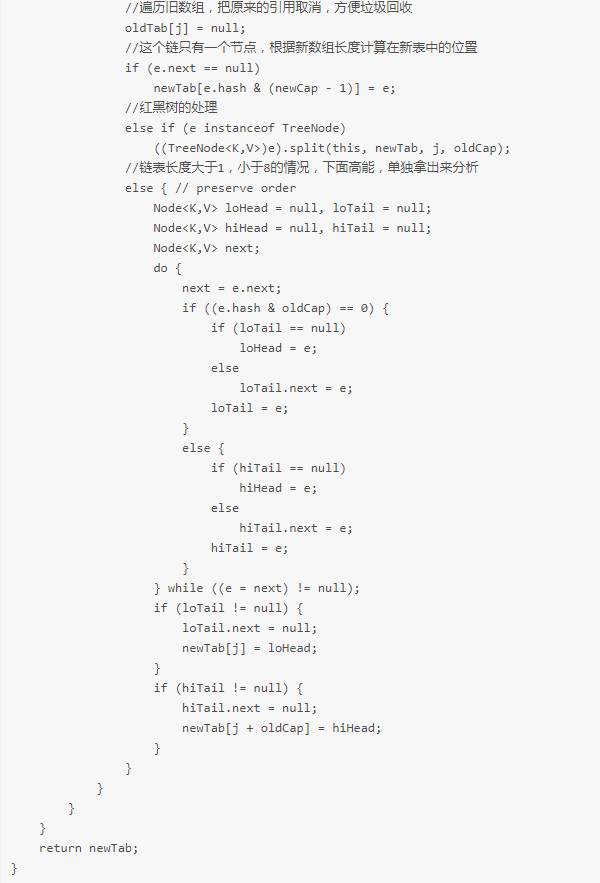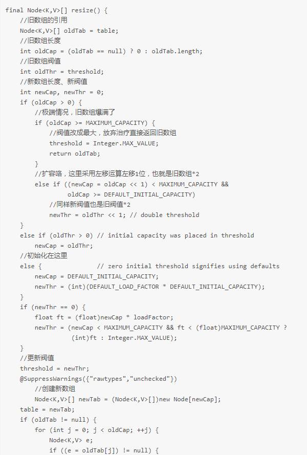 如果put的时候超过阀值,会调用 resize() 方法将数组大小扩大为原来的2倍,并且根据新表的长度计算在新表中的索引(如之前17%16 =1,现在17%32=17),看下resize方法