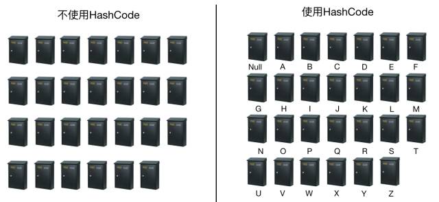 左右各有27个信箱,左边保安大哥存信的时候不做处理,想放哪个信箱就放哪个信箱,当员工去找信的时候,只好挨个信箱找,再挨个比对信箱里信封的名字,万一哥们脸黑,要找的放在最后一个信箱的最底下,悲剧…所以这种情况的时间复杂度为O(N);右边采用HashCode的方式将27个信箱分类,分类的规则是名字首字母(第一个箱子放不写名字的哥们),保安大哥将符合对应姓名的信件放在对应的信箱里,这样员工就不用挨个找了,只需要比对一个信箱里的信件即可,大大提高了效率,这种情况的时间复杂度趋于一个常数O(1)。