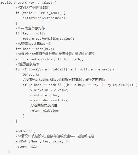 以上就是HashMap的一些先决条件,接着看平时put操作的代码实现,put的时候会遇到3种情况上面已分析过,看下Java7代码: