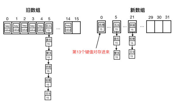 假设一个hash算法刚好算出来的的存储是这样的,在存第13个元素时要扩容