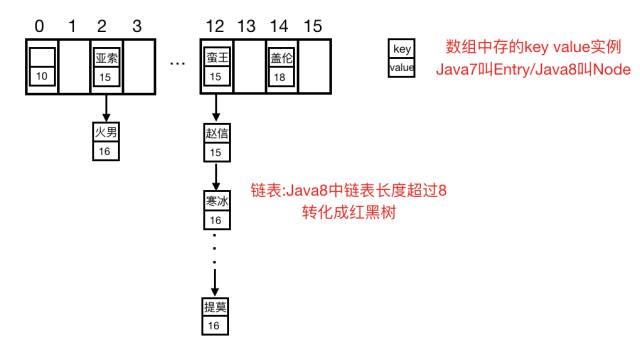 从上面的结构可以看出,通常情况下HashMap是以数组和链表的组合构成(Java8中将链表长度超过8的链表转化成红黑树)。结合上面找手机的例子,我们简单分析下HashMap存取操作的心路历程。put存一个键值对的时候(比如存上图盖伦),先根据键值”分类”,”分类”一顿操作后告诉我们,盖伦应该属于14号坑,直接定位到14号坑。接下来有几种情况: