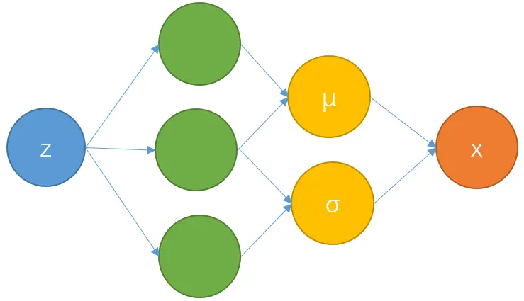 给定一个输入z,用神经网络学习变量x的分布的参数(均值和方差),约束生成样本与真实样本的相似性