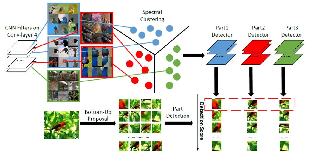 - 对于Object level得到的模型,对卷积层的filter做相似度聚类,同一类的卷积层合为一个part detector,用来为具体的对象局部做识别