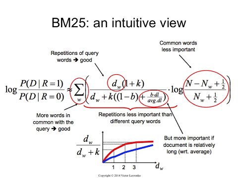 tf-idf中,这个信息直接就用“词频”,如果出现的次数比较多,一般就认为更相关。但是BM25洞察到:词频和相关性之间的关系是非线性的,具体来说,每一个词对于文档相关性的分数不会超过一个特定的阈值,当词出现的次数达到一个阈值后,其影响不再线性增长,而这个阈值会跟文档本身有关。