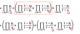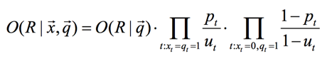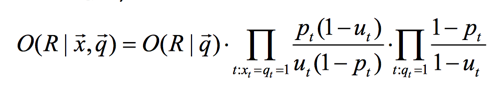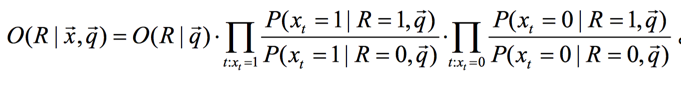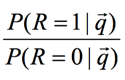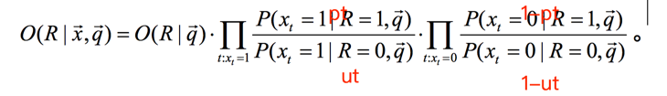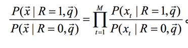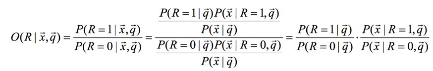 接着因为我们最终得到的是一个排序,所以,我们通过计算文档和query相关和不相关的比率,也可得文档的排序,有下面的公式: