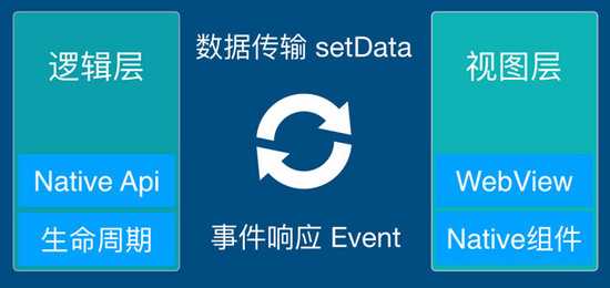 Vue.js 和小程序都是典型的逻辑视图层框架,逻辑层和视图层之间的工作方式为:数据变更驱动视图更新;视图交互触发事件,事件响应函数修改数据再次触发视图更新,如图 1 所示。