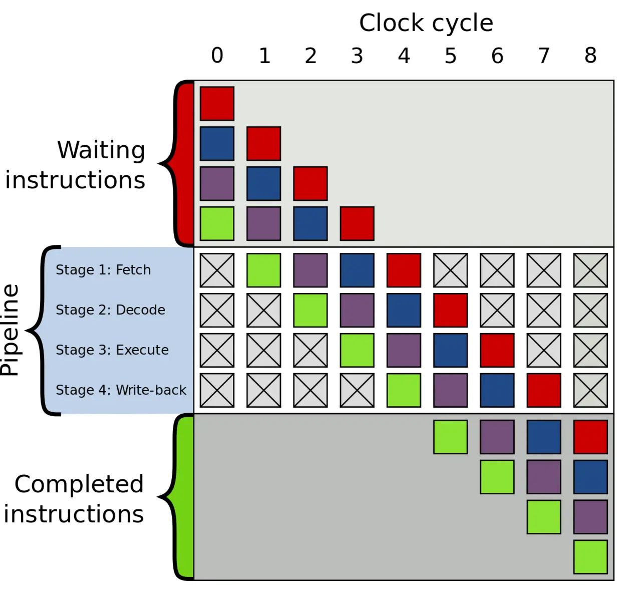 CPU的指令周期通常为取指令、解析指令读取数据、执行指令、数据写回寄存器或内存。串行执行指令时其中的读取存储数据部分占用时间较长,所以CPU普遍采取指令流水线的方式同时执行多个指令, 提高整体吞吐率,就像工厂流水线一样。