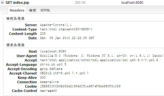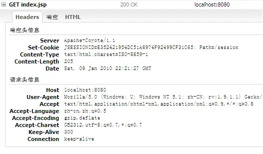 如下两幅图是笔者在Firefox的Firebug插件中的截图,可以看到,当我第一次访问index.jsp时,响应头里包含了Set-cookie头,而请求头中没有。当我再次刷新页面时,图二显示在响应中不在有Set-cookie头,而在请求头中却有了Cookie头。注意一下Cookie的名字:jsessionid,顾名思义,就是session的标识符,另外可以看到两幅图中的jsessionid的值是相同的,原因笔者就不再多解释了。另外读者可能在一些网站上见过在最后附加了一段形如jsessionid=xxx的URL,这就是采用URL重写来实现的session。