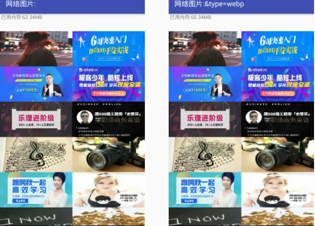 三、兼容性 根据Google提供的用户指引, Android 4.0开始可以使用WebP,Android 4.3开始提供透明度支持。接下来便是围绕着WebP在各种 情况下的表现展开的。 1. 从网络获取图片 下面是分别是从网络获取JPEG/PNG格式和WebP格式图片的效果