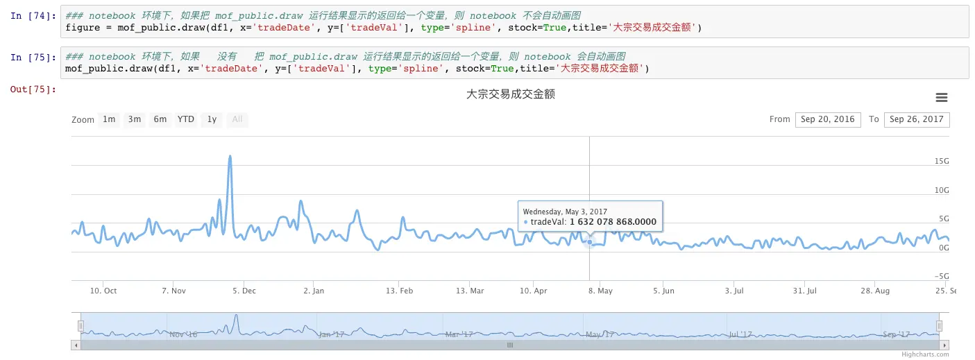ok, 到此,从 dataframe 到动态图表已经搞定了,接下来是如何结合到 ipython notebook 中,其实,上面几乎已经完成大半了,因为如果这个画图函数是在 notebook 中的单元格里最后运行的一个函数,且没有把返回结果显示的赋予一个变量的话,notebook 会默认展示函数输出的结果的。比如下面截图: