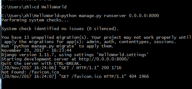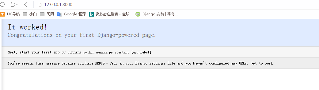 看到如图这样时,就可以用浏览器访问127.0.0.1:8000了,这时候你会看到