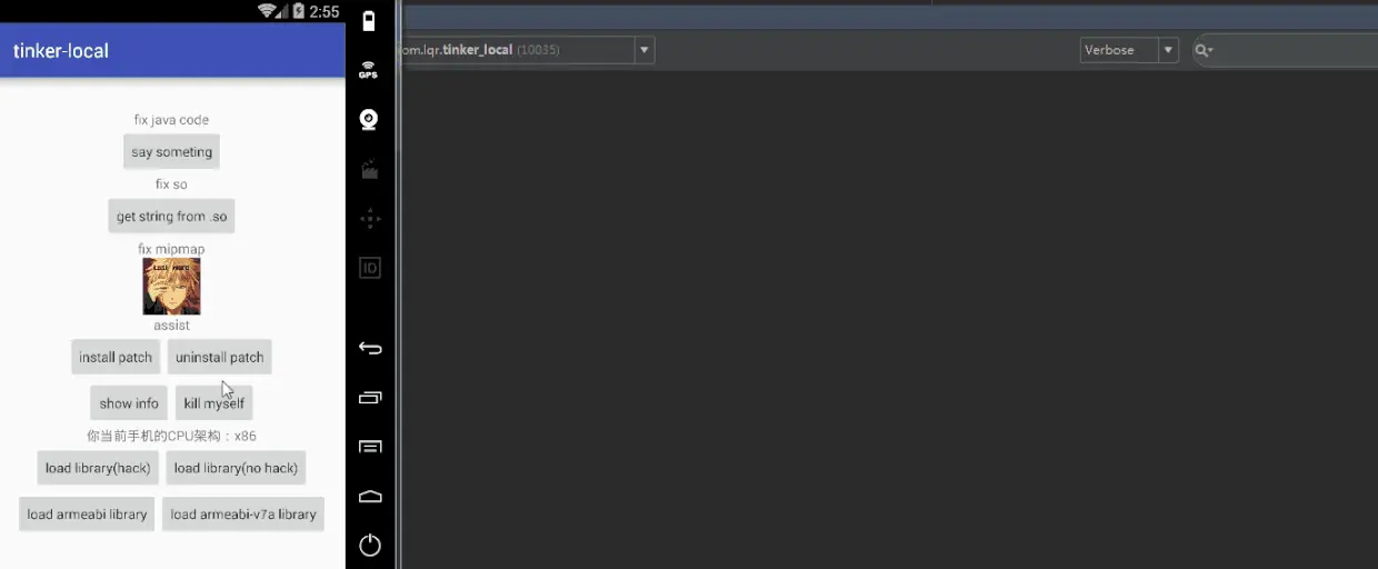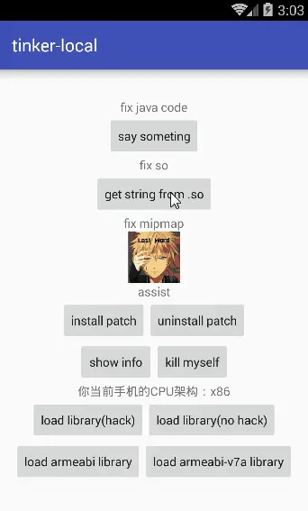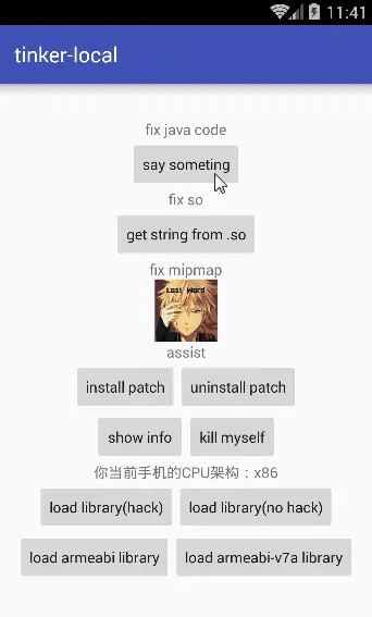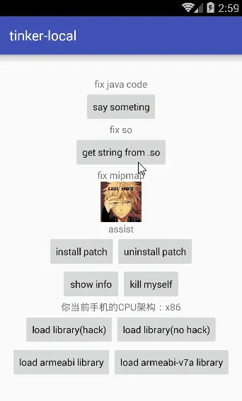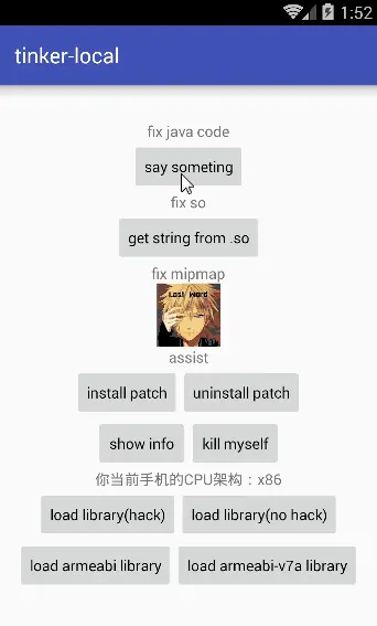 可以看到,在install patch之前,点击"get string from .so"按钮时,还是吐司"Hello LQR"。 点击"install patch"按钮后,会提示"patch success,please restart process",说明Tinker已经打上补丁了。 这时点击"show info",可以看到"patch is not loaded",说明当前补丁还没有生效。 最后,点击"kill myself"按钮,杀死当前app(进程)。