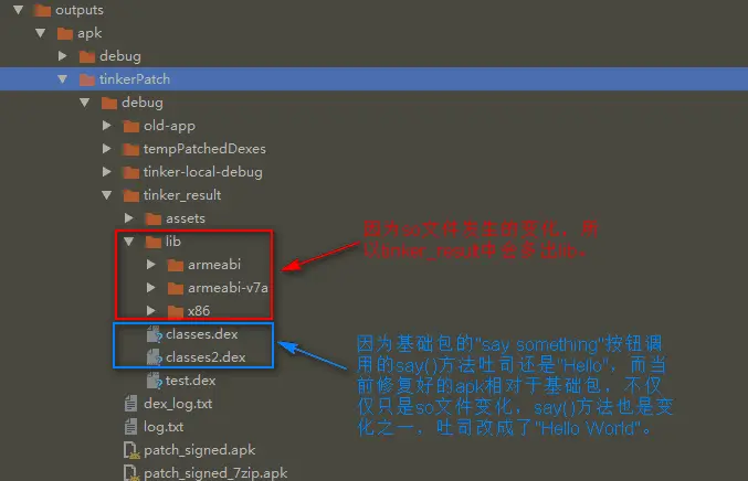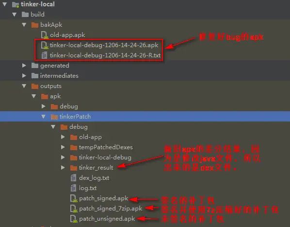 - 调用tinkerPatchDebug生成补丁包于/build/outputs/tinkerPatch/目录(默认是patch_signed_7zip.apk)。