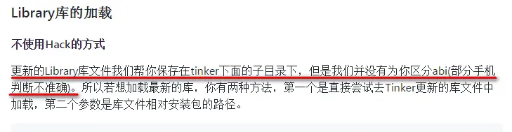 上图是Tinker官网Wiki的文档部分截图,从红线部分可以知道,因为部分手机判断abi并不准确(可能因为Android碎片化比较严重吧),Tinker没有区分abi,自然也不会在app启动时,自动加载对应的so库,这需要开发者自己判断。