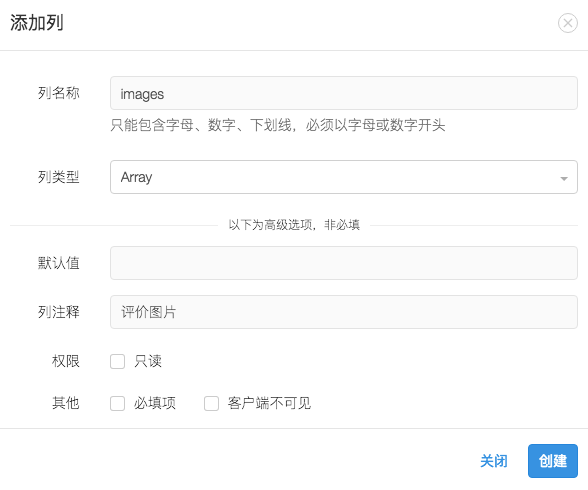 新建一张Evaluate评价表,该表保存着多图url路径数组,同时还维护商品goods表与user表的关联,以表示哪个用户user针对哪个商品作出的评价。数据表在LeanCloud用Class表示,而外键关联在LeanCloud中使用Pointer类型表示,建表与建字段如下图所示。