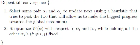 综上,SMO算法的 基本思想是将Vapnik在1982年提出的Chunking方法推到极致, SMO算法每次迭代只选出两个分量ai和aj进行调整,其它分量则保持固定不变,在得到解ai和aj之后,再用ai和aj改进其它分量。与通常的分解算法比较,尽管它可能需要更多的迭代次数,但每次迭代的计算量比较小,所以该算法表现出较好的快速收敛性,且不需要存储核矩阵,也没有矩阵运算。