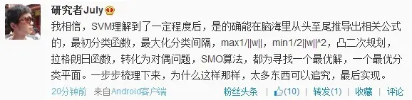 本文发表后,微博上的很多朋友给了不少意见,以下是节选的一些精彩评论:- “压力”陡增的评论→//@藏了个锋:我是看着July大神的博文长大的啊//@zlkysl:就是看了最后那一篇才决定自己的研究方向为SVM的。-- weibo.com/1580904460/zraWk0u6u?mod=weibotime 。