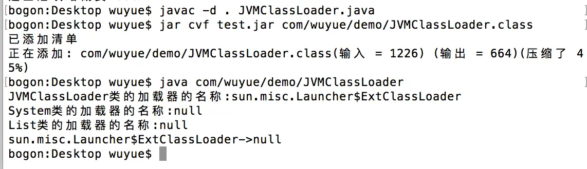 这里我们可以看到,我是先将编译好的class文件 打成一个jar包,然后再将这个打好的jar包放到我们jdk路径下的 /jre/lib/ext/ 这个目录下,前面介绍过这个目录就是ext类加载器要加载的目录,然后再次运行我们一开始编写好的程序就可以发现,同样是JVMClassLoader这个类,一开始我们的类加载器是appclassloader后面就变成了extclassloader。到这里应该就对类加载器的委托机制有了深刻认识了。
