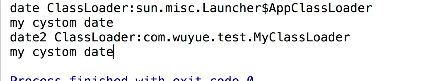 Class classDate2 = new MyClassLoader("/Users/wuyue/IdeaProjects/ClassLoaderTest/out/production/ClassLoaderTest/com/wuyue/test").loadClass("CustomDate");