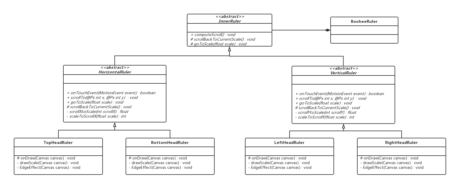 一开始是只有头向上的尺子的(只有BooheeRuler加InnerRuler,如果想了解具体的话可以参考2017/10/30前的commit),为了实现4种尺子,首先就是构建抽象类,把4种尺子共同的逻辑抽象出来,下面是描述了部分属性和方法的UML类图 :