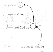 修改后的代码在getColor()函数内部声明了一个名为color的局部变量,调用该函数时,改变量就会被声明,而当第二行代码执行时,意味着必须找到并返回变量color的值,搜索过程会先从局部环境中开始,而且在局部环境中发现了一个名为color的变量,其值为"red",到此,搜索结束。return语句返回的color的值就是局部环境中得到的"red"。