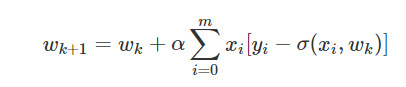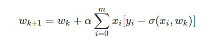 - [yi−σ(xi,wk)][yi−σ(xi,wk)]是样本第i条记录对应的分类结果值,与sigmoid函数使用wkwk作为回归系数计算的分类结果值的误差值。
