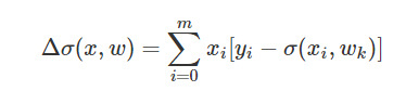 - σ(xi,wk)σ(xi,wk)是样本中第i条记录,使用sigmoid函数和wkwk作为回归系数计算的分类结果