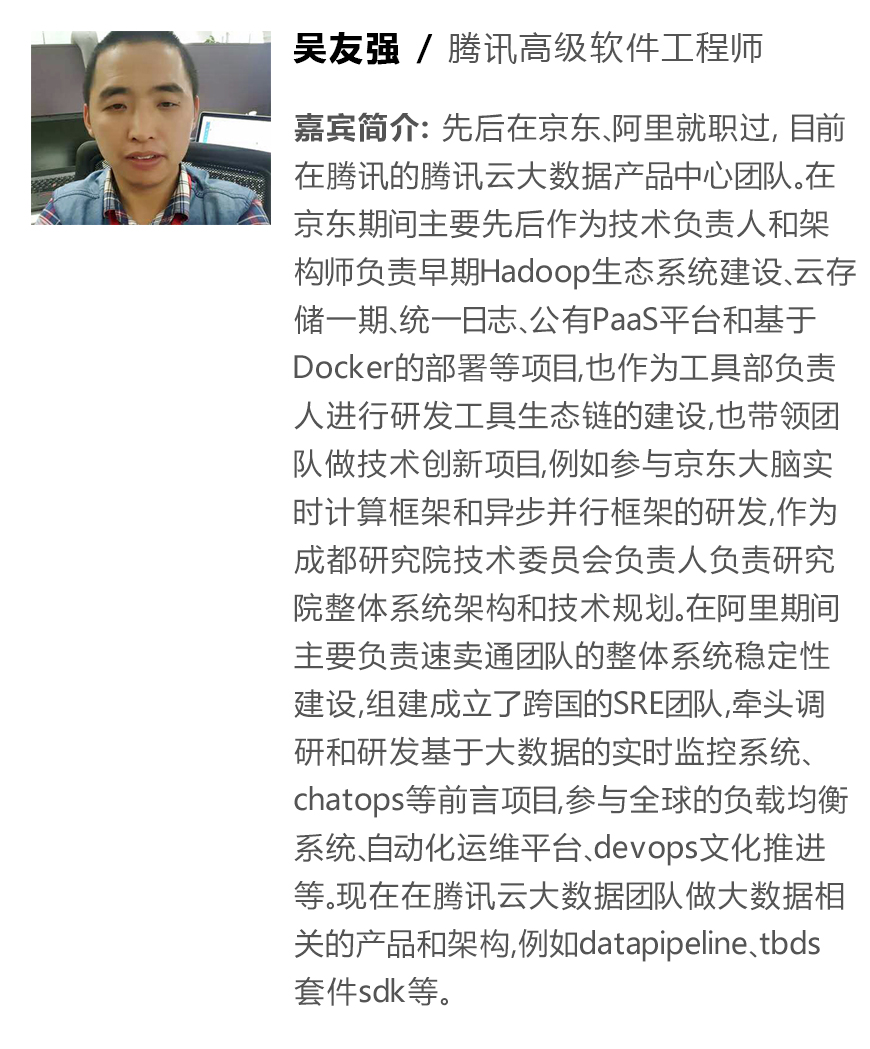 腾讯云是腾讯公司倾力打造的面向广大企业和个人的公有云平台。腾讯高级软件工程师吴友强将为我们分享大数据在腾讯云的实践。