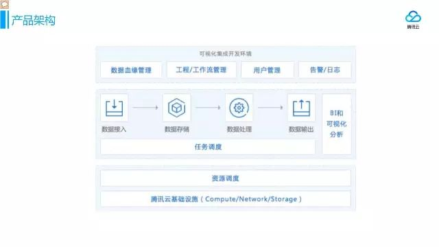 因为公有云上的用户需要简单,所以要有一个可视化的集成开发环境,在这环境中可以进行数据血缘管理、工程/工作流管理、用户管理和告警/日志。通过一些工具把数据导入到数据存储里面,然后对数据进行处理,最终输出数据。下层的任务和资源调度是用来调度用户的任务在各个资源上运行起来。底层就是腾讯云的基础设施。