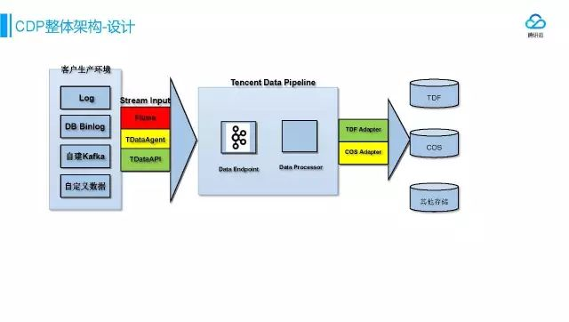 数据到达中间部分,对数据进行校验和处理。处理完成后根据用户的需求通过插件的方式实时导入到TDF、COS或者其它存储里面。