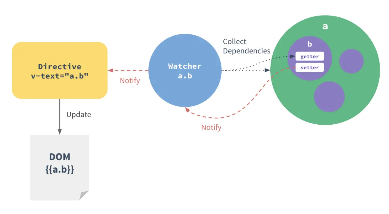官方表述:每个组件实例都有相应的 watcher 实例对象,它会在组件渲染的过程中把属性记录为依赖,之后当依赖项的 setter 被调用时,会通知 watcher 重新计算,从而致使它关联的组件得以更新。