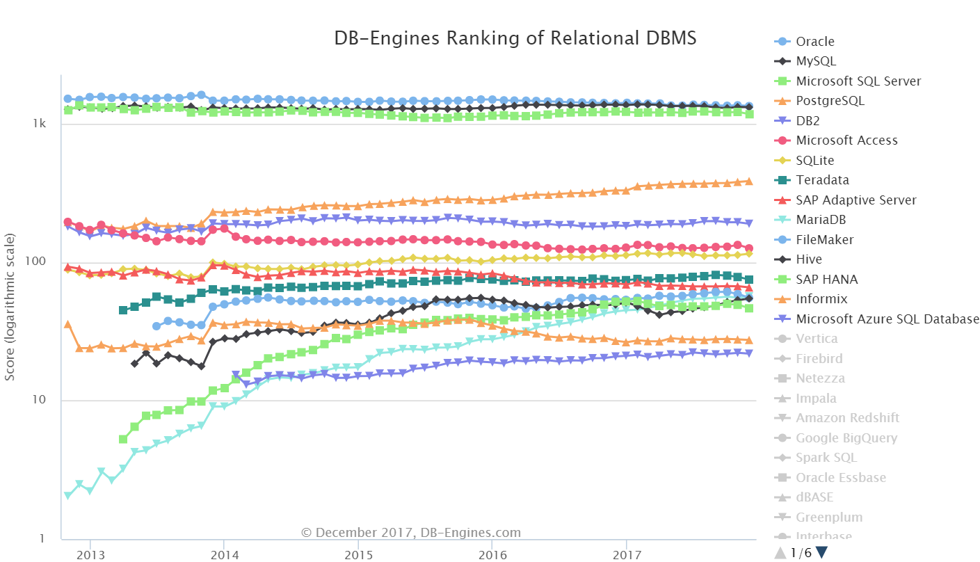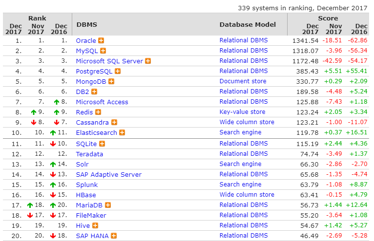 DB-Engines 发布了 2017 年 12 月份的数据库排名。排前 20 名的数据库中,Oracle 稳居第一,排名在第 9 名的 Cassandra 赶超排在第 8 名的 Redis,第 14 名的 SAP Adaptive Server 赶超第 13 名的 Solr,SQLite 有小幅下降趋势。