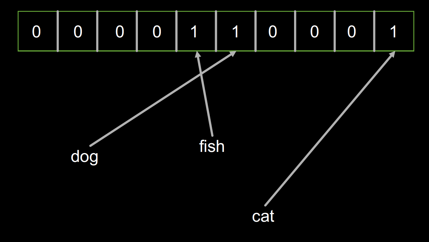 然后分别加入 ‘dog’,‘fish’,‘cat’三个对象,这时的布隆过滤器的内容如下: