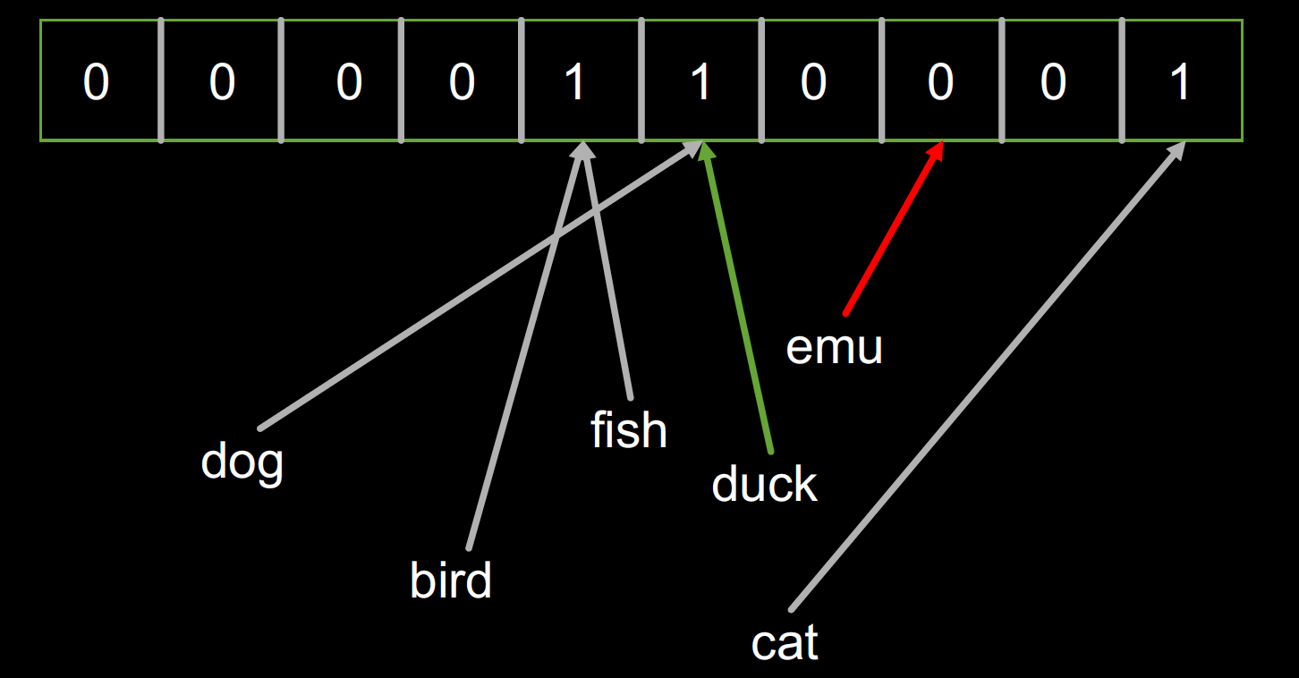 - 基本的数据结构是个数组(实际上是个位图,用1/0来记录数据是否存在),初始化是没有任何内容,所以全部置False。实际的使用当中,该数组的长度是非常大的,以保证效率。
