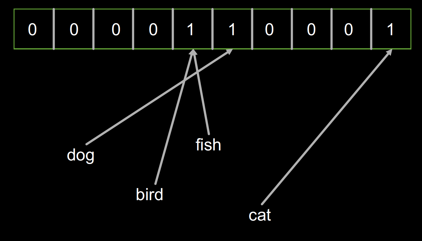 然后加入‘bird’对象,布隆过滤器的内容并没有改变,因为‘bird’和‘fish’恰好拥有相同的哈希。