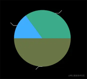 接下来,我们来绘制折线,折线的起点是每个扇形弧上的一半,path的arcTo方法也可以绘制圆,且方法参数使用也是一样,我们可以让arcTo跟着canvas.drawArc一块画,arcTo的startAngle起始角度为canvas.drawArc起始角度加上sweepAngle度数的一半,这样,就定位到了弧边的一半,arcTo的sweepAngle为0就行了,我们只定位,不绘制