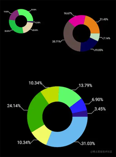 然后我们再看看效果图,饼图中间还有一块与背景色一样的黑圆,这不跟简单了嘛