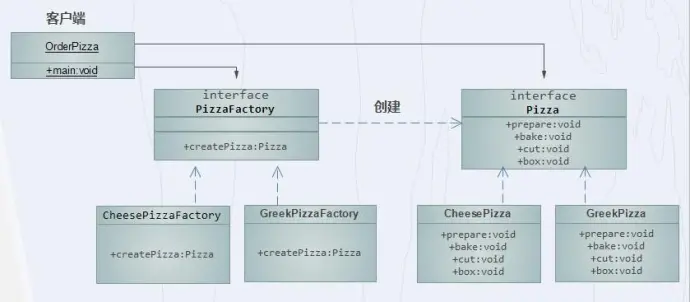 其中createPizza是个抽象方法,这里没有实现它,不过客户端调用抽象工厂时,通过createPizza就能返回具体工厂生产的具体产品。这里忽略了具体产品实现的过程。