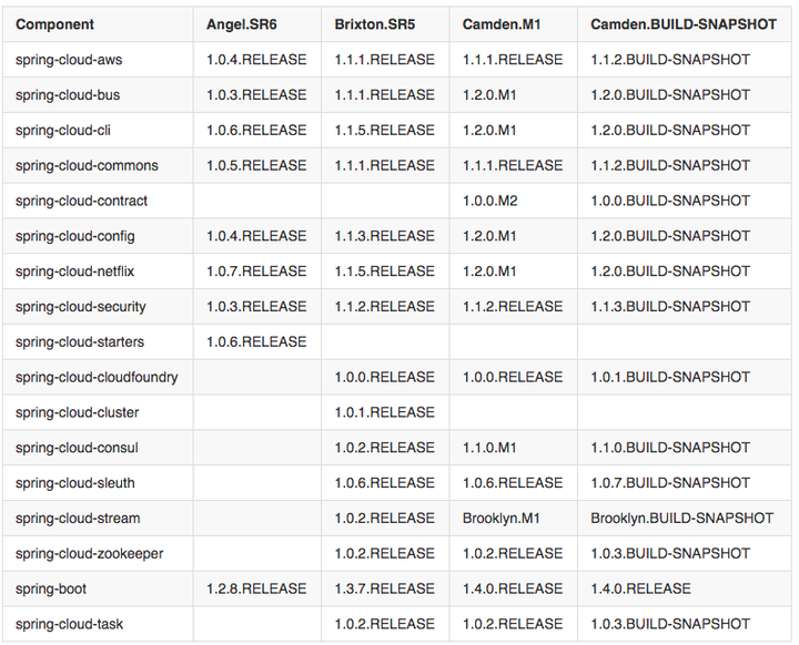 不难看出,最初的Angel版本相对来说拥有的子项目较少,Brixton、Camden则拥有更全的子项目,所以能提供更多的组件支持。而Brixton与Camden之间,Brixton的发布子项目更为稳定,Camden则更为前瞻。