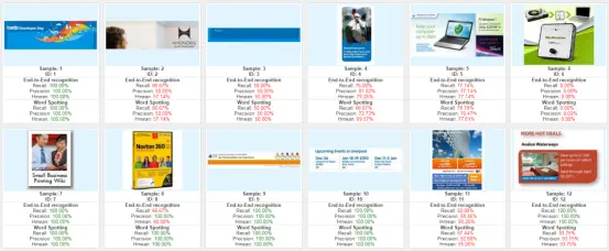 互联网图片端到端任务部分结果如下图所示,详细结果可在网站上查询:rrc.cvc.uab.es/?ch=1&com=e…