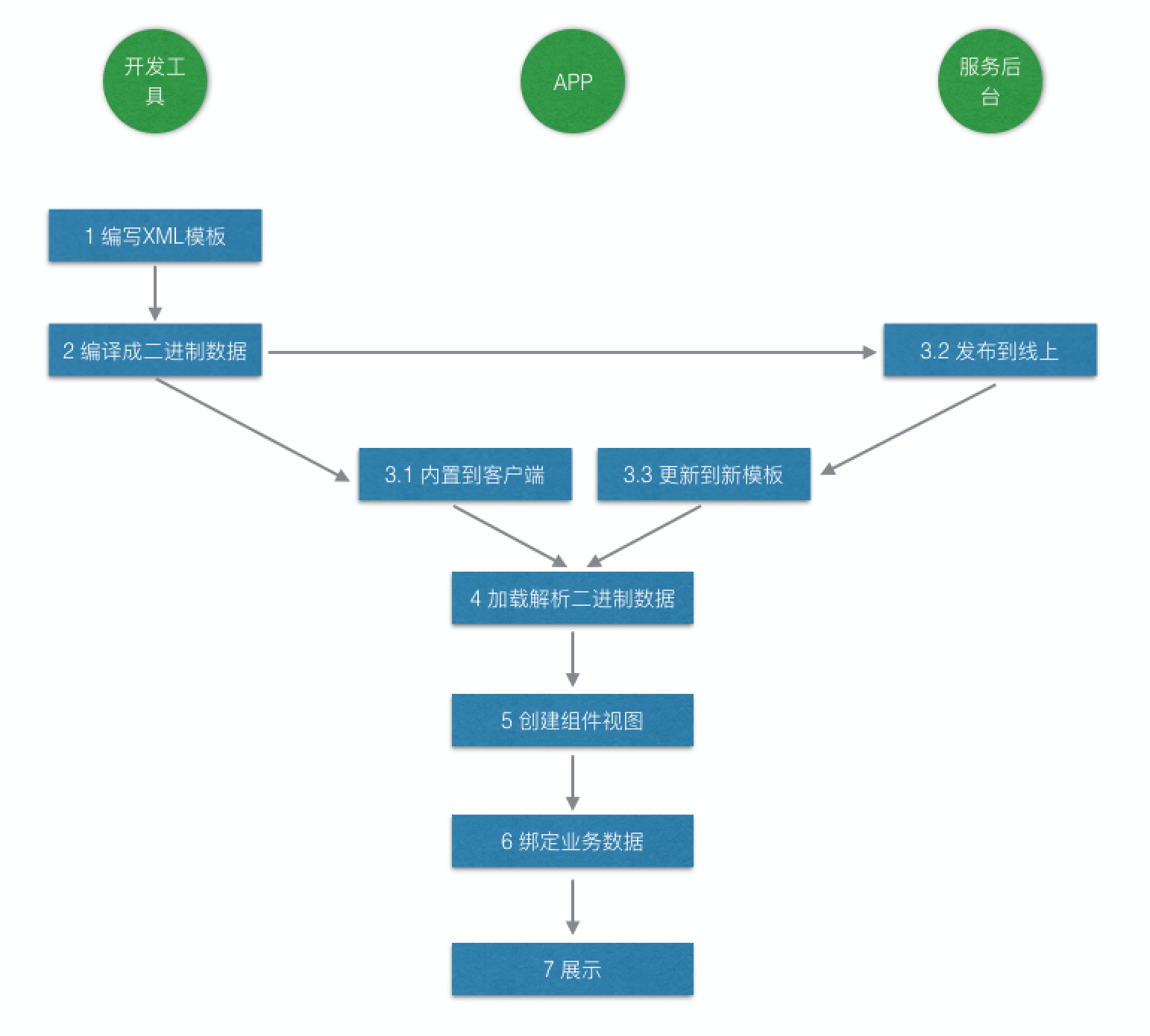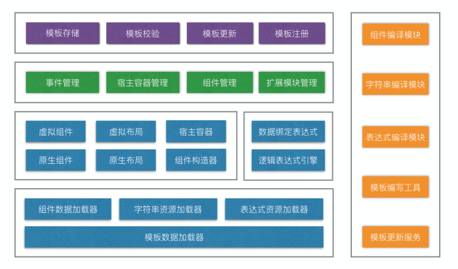 - 模板存储、模板校验、模板更新、模板注册则分别负责模板数据的存储、安全性校验、版本校验、与更新检查与新模板下载、注册模板数据到框架,整体协同来完成业务组件的动态更新,它并不与整个渲染组件的核心框架耦合,可以作为独立模块存在。
