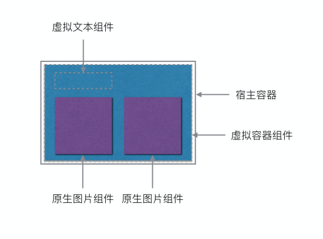 不论是虚拟化组件还是原生组件,都采用上述相同的模型来定义,再加上相同的尺寸计算接口、布局接口、绘制接口,这样对于宿主容器来说,包装在内部的组件就不分虚拟化还是原生,一视同仁,暴露给外面的接口也是一样的,只要将宿主容器像普通的 View 一样添加到的视图界面上,就可以在后续的渲染过程中显示出来。如果虚拟组件使用的越多,View 的个数就越少,对于系统来说层级越扁平。以下图示例的组件来说,最终呈现的 View 只有宿主容器和两个图片组件,如果将图片也用虚拟化的方式实现,最终 View 只有一个宿主容器,而界面仍然保持不变。