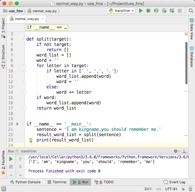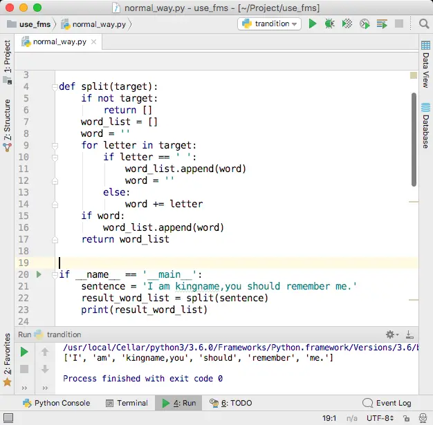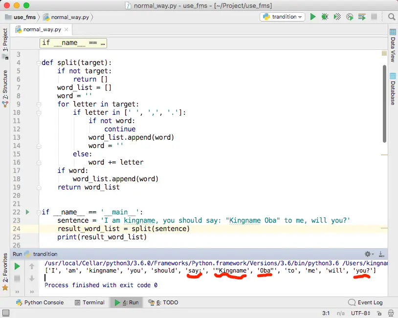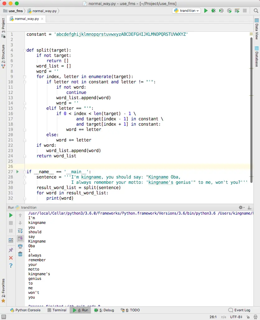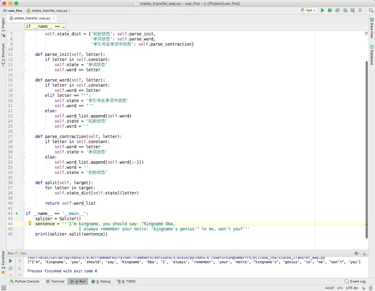 举一个例子:I'm kingname, you should say: "Kingname Oba, I always remember your motto: 'kingname's genius'" to me, won't you?这个句子中,should这个单词就是处于“单词状态”。它不在单引号内部,它也不是一个缩写。当我们对句子每个字符进行遍历的时候,遍历到“should”的“s”时进入“单词状态”,在单词状态,只需要关心接下来过来的下一个字符是什么,如果是字母,那依然是单词状态,把字母直接拼接上来即可。如果是单引号,那么进入“单引号在单词中状态”。至于“单引号在单词中状态”有什么逻辑,单词状态的代码根本不需要知道。这就像是接力赛,我把棒交给下一个人,我的任务就做完了,下一个人是跑到终点还是爬到终点,都和我没有关系。